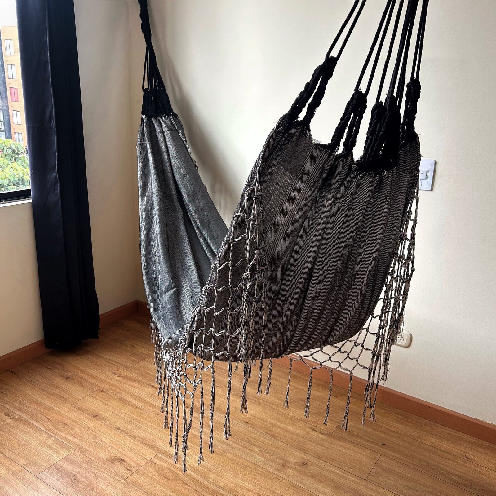 Sé el primero en valorar “Hamaca en Algodón con Flecos Negro-Gris Jaspiado”